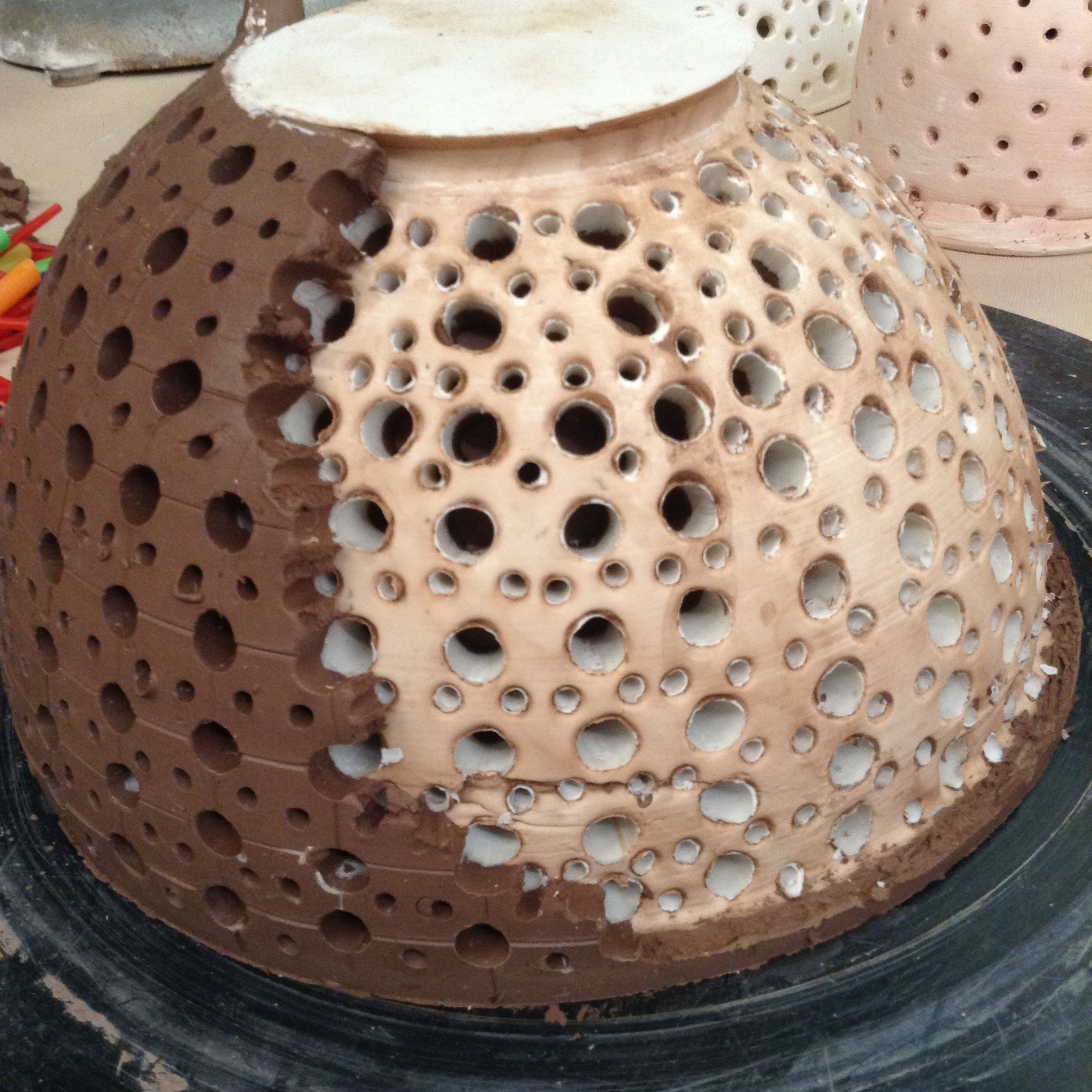 From and engineering and artistic perspective, there's already a great deal of work using liquid slip as casting material and thicker slip as a drawing medium. To add to that body of work, I'm using paper as non-typical shaping methods for the thickest versions of the slip recipes. Using this paper-clay-paper laminate, I'm exploring the methods needed to make functional pieces or sculptural objects in ways that could scale up to many dozens of pieces. Plus, it's fun and the resulting forms happen fast. These methods have the incremental-slice methodology of digital 3D printing, but also retain some of the analog hand variations possible with sculpting. Since it's a mix of processes, at the moment I'm calling it "hand-printing."